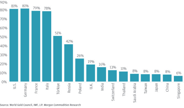 Η JP Morgan επισημαίνει ότι αν χώρες με ποσοστό χρυσού κάτω του 10% στα αποθεματικά τους αύξαναν το μερίδιο αυτό στο 10%, θα απαιτούνταν αγορές έως και 2.600 τόνων, ακόμη και με τιμές 4.000 δολαρίων ανά ουγγιά.