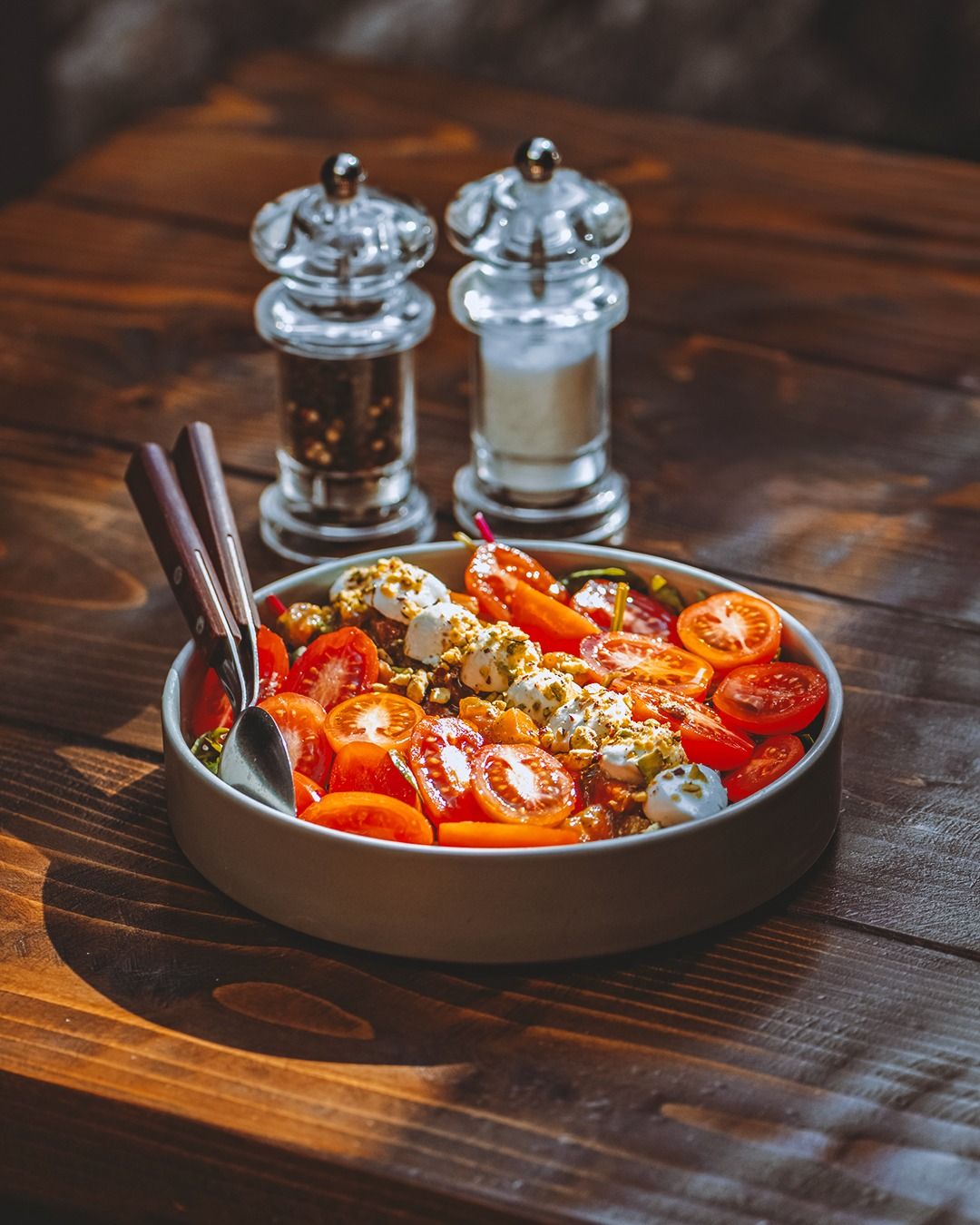 Στο τραπέζι έρχονται τα κολοκυθάκια sticks με τη σπιτική σκορδομαγιονέζα, τραγανά και ανάλαφρα. Δίπλα, η σαλάτα που φέρει το όνομα του μαγαζιού, η «Μπριγκάντα»: iceberg, baby ρόκα, βαλεριάνα, σπανάκι, μανούρι, καρύδι, αποξηραμένο σύκο και βινεγκρέτ μελιού, όλα σε τέλεια ισορροπία.