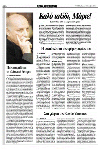 *Κείμενο αποχαιρετισμού του Μάριου Πλωρίτη, που έφερε τον τίτλο «Στη γιάφκα της Rue de Varennes» και είχε δημοσιευτεί στην εφημερίδα «Το Βήμα» την τελευταία ημέρα του 2006. Συντάκτης του ήταν ο Κωνσταντίνος Τσουκαλάς, διακεκριμένος κοινωνιολόγος, πανεπιστημιακός δάσκαλος (νυν ομότιμος καθηγητής της Κοινωνιολογίας στο Τμήμα Πολιτικής Επιστήμης και Δημόσιας Διοίκησης του Πανεπιστημίου Αθηνών) και ακαδημαϊκός.