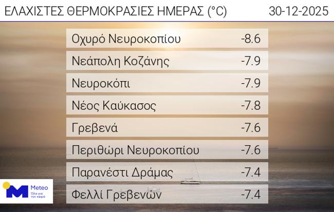 Σύμφωνα με το δίκτυο αυτόματων μετεωρολογικών σταθμών του Εθνικού Αστεροσκοπείου Αθηνών / meteo.gr οι οκτώ χαμηλότερες ελάχιστες θερμοκρασίες κατά τις πρωινές ώρες της Τρίτης 30/12, παρουσιάζονται στον παρακάτω πίνακα.