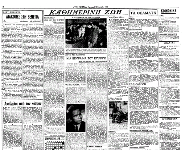 *Άρθρο της εφημερίδας «Το Βήμα» για το διάσημο βρετανό λογοτέχνη Ράντγιαρντ Κίπλινγκ, για τη ζωή και το έργο του. Το κείμενο είχε δημοσιευτεί στο φύλλο της 18ης Νοεμβρίου 1955, υπό τον τίτλο «Μια βιογραφία του Κίπλινγκ – Από την δόξαν εις την παρακμήν».