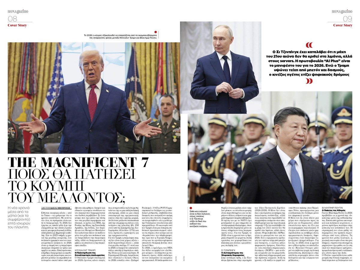 Το περιοδικό BHMAGAZINO που κυκλοφορεί την Κυριακή 4 Ιανουαρίου, όπως πάντα με το ΒΗΜΑ της Κυριακής, φιλοξενεί στο εξώφυλλό του, μέσα από ένα ιδιαίτερο, εντυπωσιακό γράφημα, τους επτά πιο ισχυρούς ηγέτες του κόσμου.