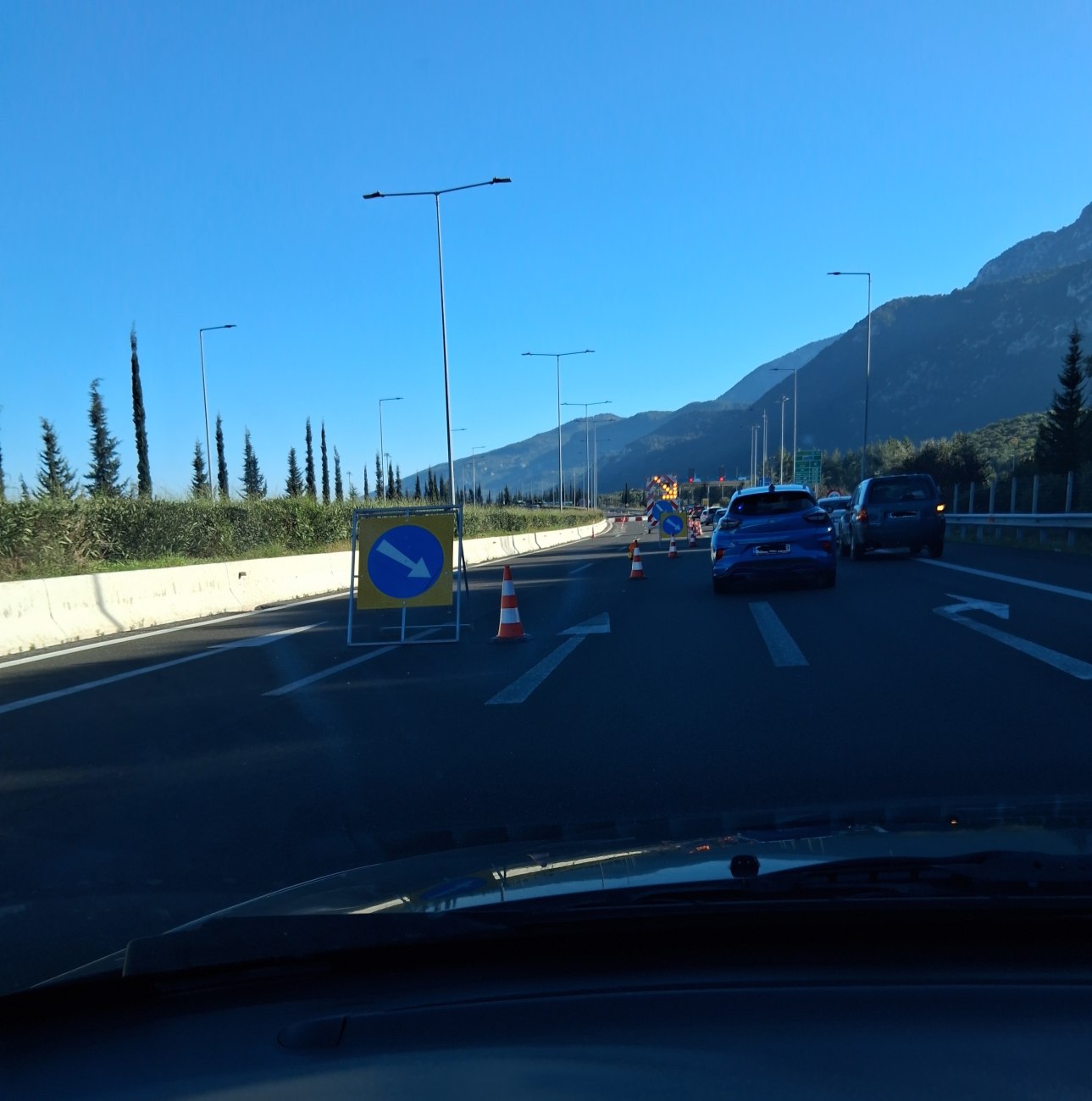 Ωστόσο, έτσι η Τροχαία κατάφερε να δημιουργήσει μια ουρά αυτοκινήτων 14 χλμ (στο ύψος της Ανθήλης περίπου) λόγω των κώνων που στενεύουν απελπιστικά τον δρόμο σε μια λωρίδα.