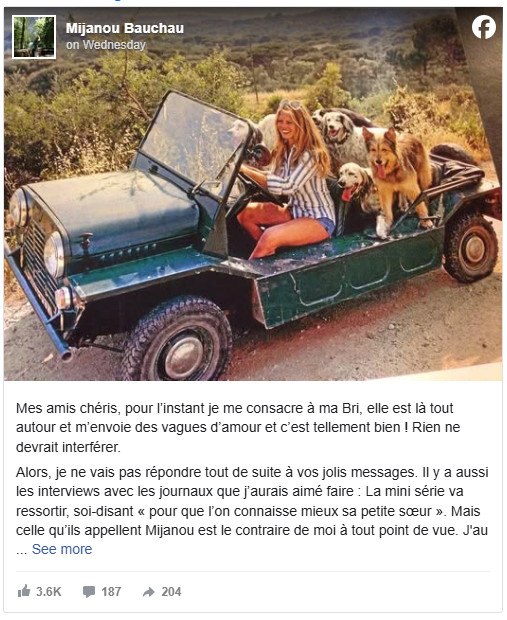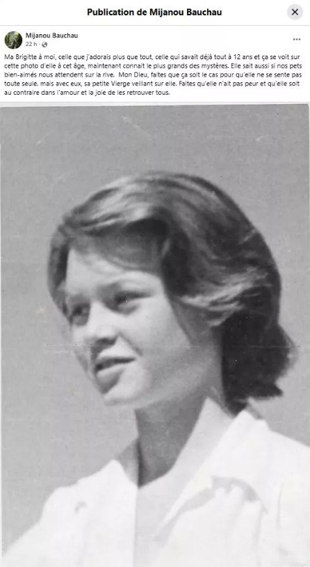«Η Μπριζίτ μου, αυτή που αγαπούσα περισσότερο από οτιδήποτε, αυτή που ήδη ήξερε τα πάντα στα 12 της χρόνια, και μπορείτε να το δείτε σε αυτή τη φωτογραφία της σε εκείνη την ηλικία, τώρα γνωρίζει το μεγαλύτερο μυστήριο» έγραψε σε ανάρτηση της.