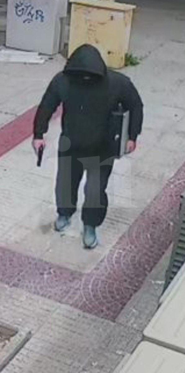 Κάμερα ασφαλείας κατέγραψε τον μαυροφορεμένο δράστη με το όπλο στο χέρι την ώρα που έχει βγει από το ζαχαροπλαστείο και απομακρύνεται με αργά βήματα.