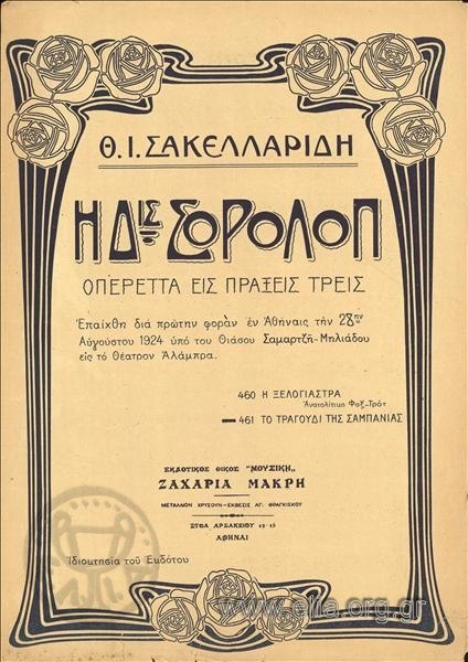 Η οπερέτα του Θεόφραστου Σακελλαρίδη «Η Δις Σορολόπ» παρουσιάστηκε πρώτη φορά στην Αθήνα στις 28 Αυγούστου 1924, από το θίασο Σαμαρτζή – Μηλιάδη στο θέατρο «Αλάμπρα».
