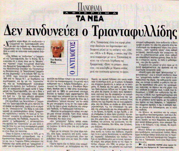 Στις 2 Ιανουαρίου 1996 έφυγε από τη ζωή ο Βασίλης Δ. Φόρης, διακεκριμένος φιλόλογος και γλωσσολόγος, ο οποίος διαδραμάτισε πρωταγωνιστικό ρόλο στην τελευταία περίοδο του δημοτικιστικού κινήματος, καθώς και στην επίσημη καθιέρωση του μονοτονικού συστήματος γραφής της νεοελληνικής γλώσσας (1982).