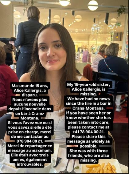 Αγωνία για την 15χρονη Αλίκη Καλλέργη που αγνοείται μετά τη φωτιά σε μπαρ στο Κραν Μοντανά - Δόθηκε στη δημοσιότητα το πρώτο όνομα θύματος από τη φονική πυρκαγιά