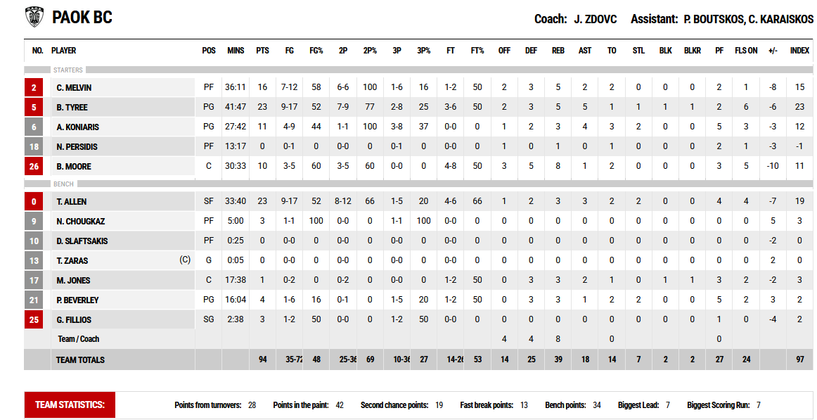 Ο εκπληκτικός Ρέι ήταν ο κορυφαίος της αναμέτρησης με 30 πόντους, 5 ριμπάουντ και 4 ασίστ ενώ 19 πόντους με 7 ασίστ είχε ο Άπλμεμπι. Για τον ΠΑΟΚ από την άλλη, Ταϊρί και Άλεν είχαν από 23 πόντους ενώ ο Μπέβερλι έμεινε στους 4.