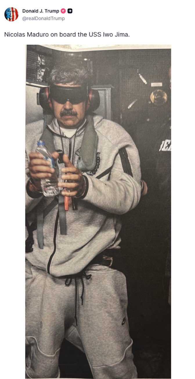 Σχεδόν ακριβώς επτά ώρες αφότου ο Τραμπ ανακοίνωσε την επιχείρηση στο Truth Social, έκανε μια νέα ανάρτηση. Ήταν η φωτογραφία του συλληφθέντος ηγέτη της Βενεζουέλας με δεμένα μάτια, χειροπέδες και γκρι φόρμα.