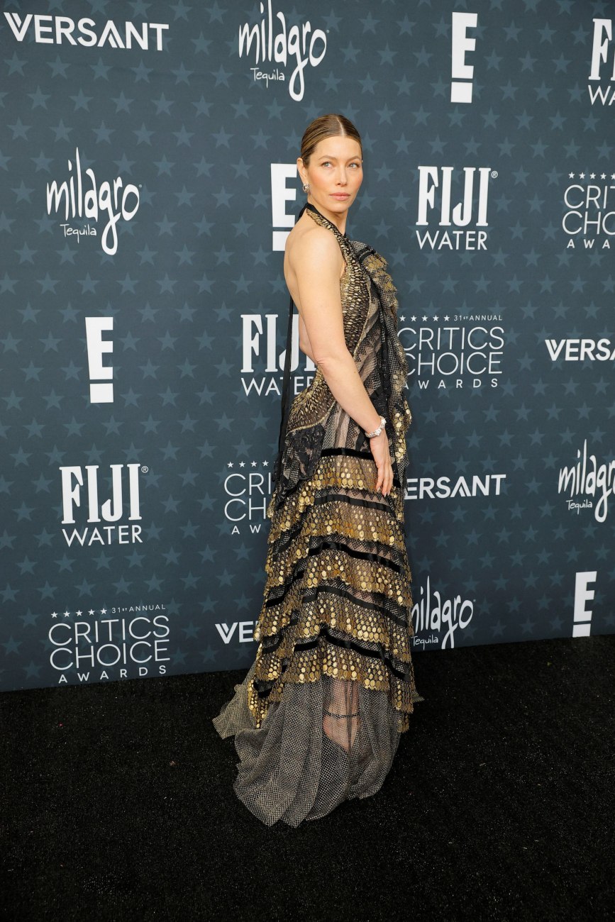Η Jessica Biel από το The Better Sister δημιούργησε μια από τις πιο εντυπωσιακές στιγμές της βραδιάς κατά την άφιξή της στα Critics Choice Awards, φορώντας ένα φόρεμα Lanvin που σχεδόν αιωρούταν στο χαλί. Το φόρεμα με ανοιχτή πλάτη και βολάν του δημιουργικού διευθυντή της Lanvin, Peter Copping, ήταν φτιαγμένο από δίχτυ, δαντέλα και άφθονες χρυσες πούλιες. Η Biel ολοκλήρωσε το look με μια συλλογή κοσμημάτων Cartier σε κίτρινο και λευκό χρυσό, διακοσμημένα με διαμάντια.