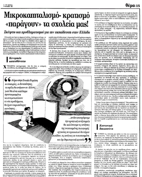 Η αναβάθμιση των δημοσίων γυμνασίων και των λυκείων, που πρέπει να περάσει από την αναβάθμιση των ίδιων των διδασκόντων και της οικονομικής και κοινωνικής θέσης τους, και η επιδίωξη για μείωση —αν όχι για πλήρη κατάργηση— της παραπαιδείας αποτελούν βασικές προϋποθέσεις της προόδου.