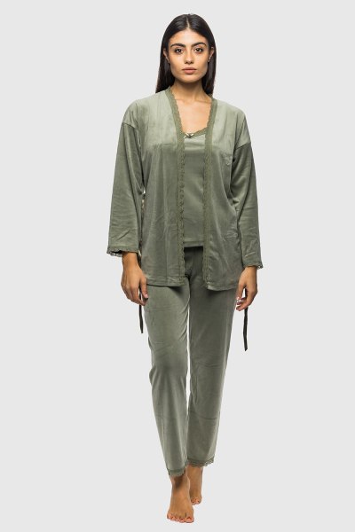 Ένα ολοκληρωμένο σετ που συνδυάζει πρακτικότητα και στιλ. Η βελούδινη ρόμπα προσθέτει ζεστασιά και πολυτέλεια, ενώ το χακί χρώμα δίνει μια πιο μοντέρνα, earthy αισθητική. Το τέλειο σύνολο από την Mihra για cozy weekends.