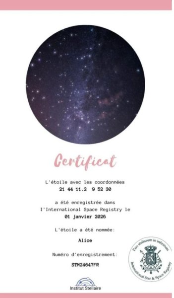 Σύμφωνα με το έγγραφο, αστέρι με συγκεκριμένες αστρονομικές συντεταγμένες καταχωρήθηκε την 1η Ιανουαρίου 2026 και έλαβε το όνομα «Αλίκη».