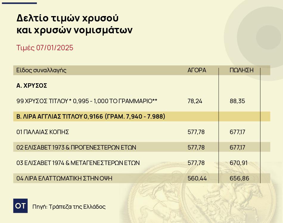 Με βάση το  δελτίο τιμών, η ΤτΕ αγοράζει την χρυσή λίρα (Αγγλίας, παλαιάς κοπής) στα 864,45 ευρώ και την πουλάει στα 1012,78 ευρώ.