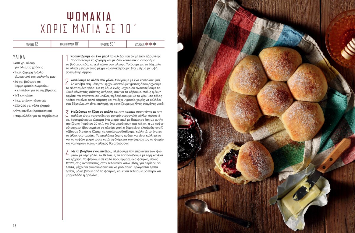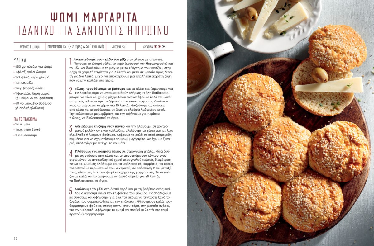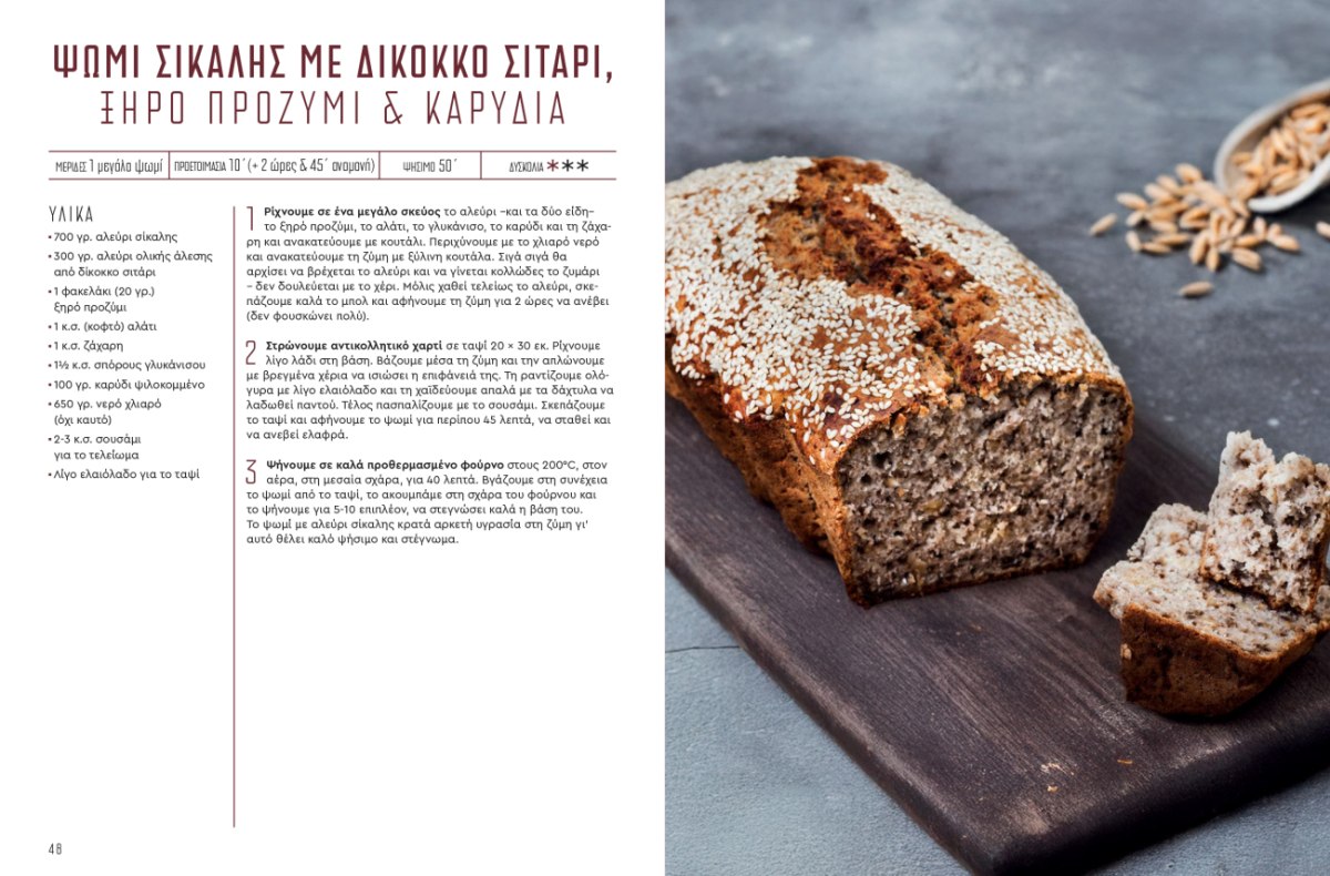 Στις σελίδες του βιβλίου ξεδιπλώνεται ένας πλούσιος και λαχταριστός κόσμος από ψωμιά και ζύμες: σπιτικό αφράτο ψωμί, ψωμάκια χωρίς μαγιά, ψωμί φόρμας, ψωμί ντίνκελ με προζύμι και σπόρους, εύκολη τσιαπάτα χωρίς ζύμωμα, μαλακά ψωμάκια για μπέργκερ, ψωμί στη γάστρα, μπριός, παραδοσιακό ψωμί με προζύμι, χωριάτικο λαδόψωμο και πολλές ακόμη αγαπημένες εκδοχές. Παράλληλα, το τεύχος περιλαμβάνει γλυκές και αλμυρές ζύμες, όπως babka σοκολάτας, cinnamon rolls, λουκουμάδες, pancakes, danish, donuts, τσουρέκια, σφολιατίνια, πίτες και παραδοσιακές συνταγές που ξυπνούν μνήμες και γεμίζουν το σπίτι αρώματα.
