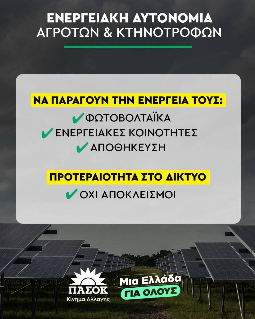 «Όχι άλλη προσχηματική στήριξη, ώρα για πραγματική ενεργειακή δικαιοσύνη» αναφέρει, σημειώνοντας ότι το ΓΑΙΑ εγκλώβισε τους αγρότες.