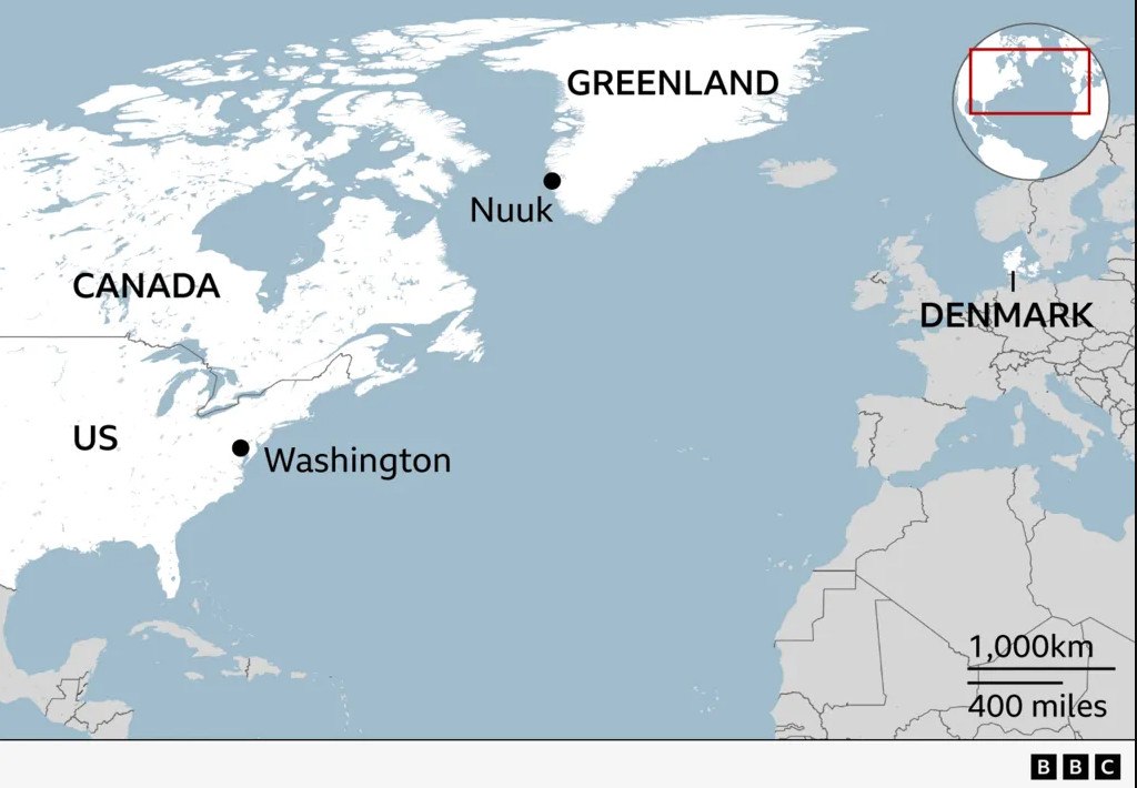 Το BBC υπογραμμίζει ότι υπάρχει αυξανόμενο ενδιαφέρον από τη Ρωσία και την Κίνα για το νησί, το οποίο διαθέτει ανεκμετάλλευτα κοιτάσματα σπάνιων γαιών, καθώς η τήξη των πάγων αυξάνει την πιθανότητα δημιουργίας νέων εμπορικών διαδρομών.
