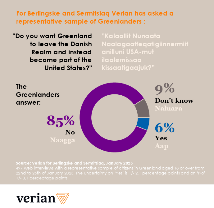 Η προαναφερθείσα δημοσκόπηση έδειξε επίσης ότι το 85% των Γροιλανδών αντιτίθεται στην ένταξη της περιοχής στις ΗΠΑ, και ακόμη και τα μέλη του κινήματος ανεξαρτησίας, που είναι φιλικά προς τον Τραμπ, δεν είναι ενθουσιασμένα με αυτή την προοπτική.