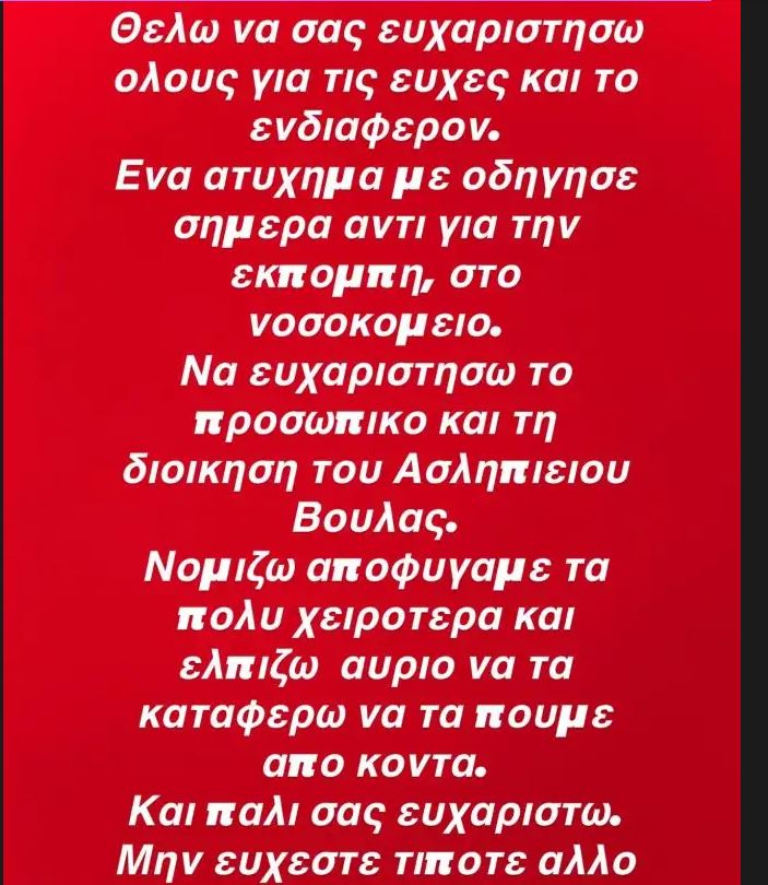 «Θέλω να σας ευχαριστήσω όλους για τις ευχές και το ενδιαφέρον. Ένα ατύχημα με οδήγησε σήμερα, αντί για την εκπομπή, στο νοσοκομείο. Να ευχαριστήσω το προσωπικό και τη διοίκηση του Ασκληπιείου Βούλας. Νομίζω αποφύγαμε τα πολύ χειρότερα και ελπίζω αύριο να τα καταφέρω να τα πούμε από κοντά. Και πάλι σας ευχαριστώ».