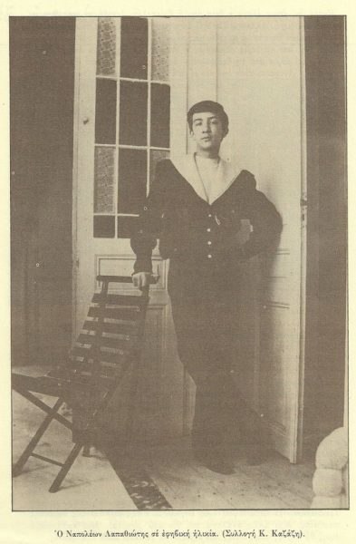 Στην κεντρική φωτογραφία του παρόντος άρθρου, ο Ναπολέων Λαπαθιώτης ως πρωτοετής φοιτητής της Νομικής Σχολής του Πανεπιστημίου Αθηνών, το 1904 (πηγή: booksjournal.gr, τεύχος 122, Σεπτέμβριος 2021).