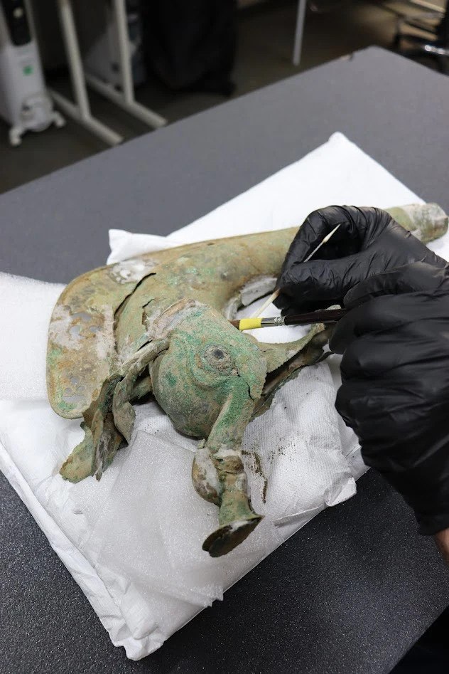 Το εύρημα εντοπίστηκε το περασμένο καλοκαίρι, στο πλαίσιο ανασκαφών που έφεραν στο φως έναν ολόκληρο θησαυρό αντικειμένων της περιόδου. Ανάμεσά τους ξεχωρίζει ένα carnyx – ένα εντυπωσιακό χάλκινο πνευστό όργανο, που οι Κέλτες χρησιμοποιούσαν στο πεδίο της μάχης για να τρομοκρατούν τον αντίπαλο.