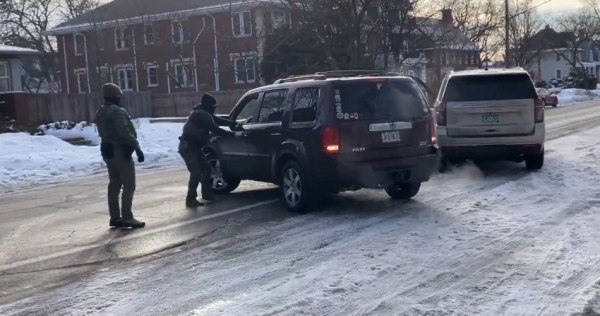 Σε βίντεο που κυκλοφορεί στα social media, δείχνει τους αστυνομικούς να κατευθύνονται προς το SUV, σε χιονισμένο δρόμο.