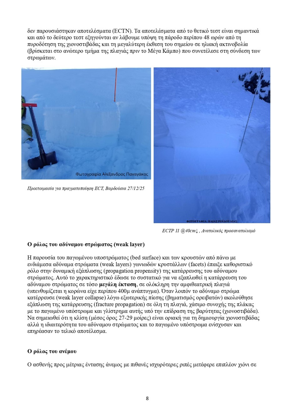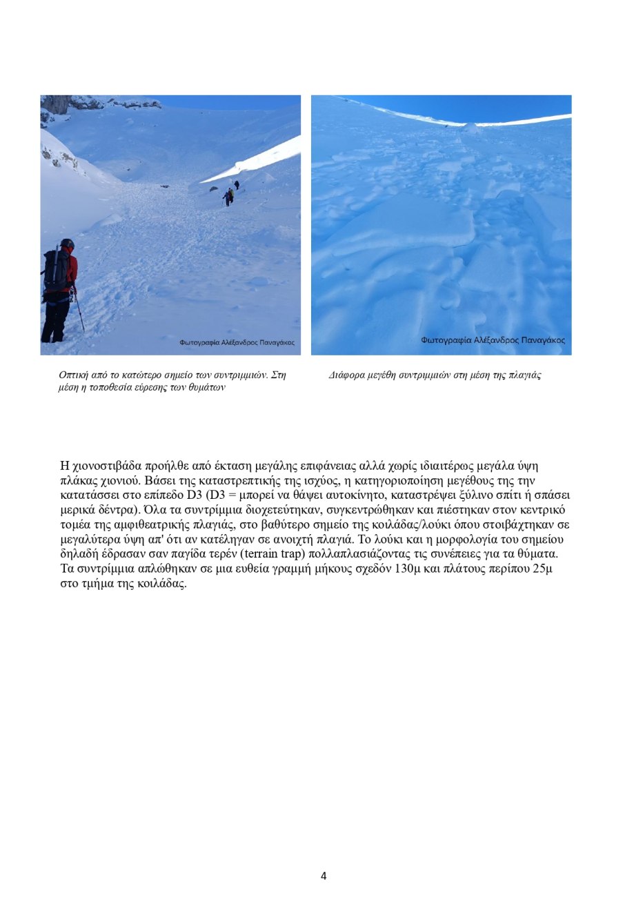 Στο δεύτερο μέρος της έκθεσης, η ομάδα περιγράφει αναλυτικά το φαινόμενο ως χιονοστιβάδα πλάκας: «Η χιονοστιβάδα ήταν κατηγορίας πλάκας (slab avalanche)», με κορώνα «περίπου 400 μέτρα» και καταστροφική ισχύ που την κατατάσσει στο επίπεδο «D3», δηλαδή ικανή «να θάψει αυτοκίνητο, να καταστρέψει ξύλινο σπίτι ή να σπάσει μερικά δέντρα».