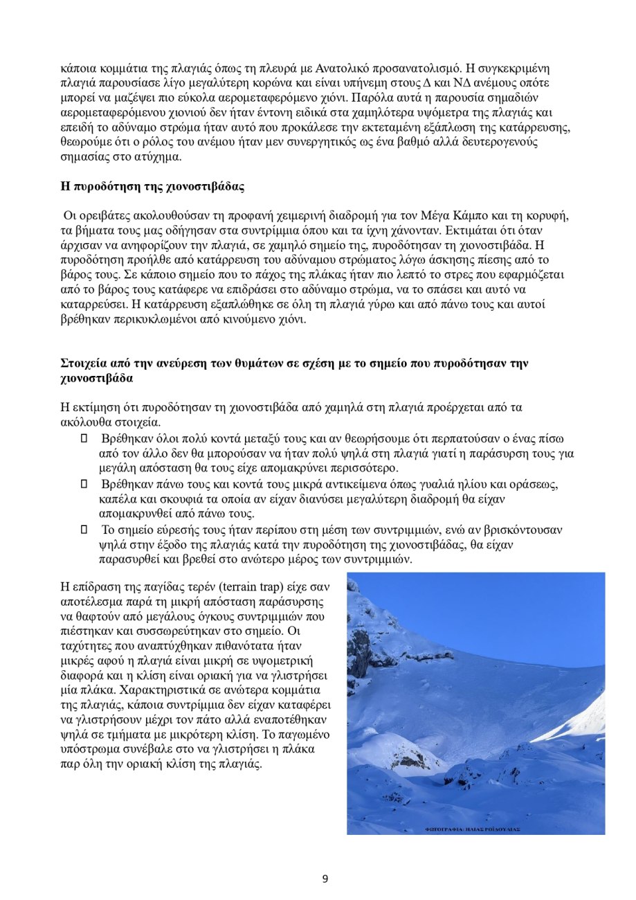 Τέλος, η έκθεση υπογραμμίζει ότι η τραγωδία συνέβη σε οριακή κλίση πλαγιάς, περίπου 27–29 μοιρών, επισημαίνοντας πως: «Η κλίση είναι οριακή για τη δημιουργία χιονοστιβάδας αλλά η ιδιαιτερότητα του αδύναμου στρώματος και το παγωμένο υπόστρωμα ενίσχυσαν και επηρέασαν το τελικό αποτέλεσμα».