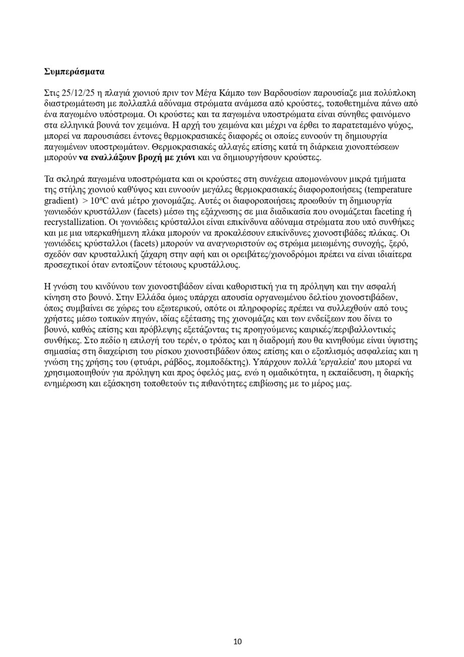 Το συμπέρασμα της έκθεσης είναι σαφές: στα ελληνικά βουνά, όπου απουσιάζει οργανωμένο δελτίο χιονοστιβάδων, η γνώση της χιονομάζας, η ανάγνωση του τερέν και η εκπαίδευση στη διαχείριση κινδύνου δεν αποτελούν πολυτέλεια αλλά ζήτημα ζωής και θανάτου. Η συγκεκριμένη τραγωδία δείχνει πώς ένας συνδυασμός φυσικών παραγόντων και ανθρώπινης παρουσίας, χωρίς εμφανή προειδοποιητικά σημάδια στο πεδίο, μπορεί να οδηγήσει σε καταστροφικά αποτελέσματα. «Η γνώση του κινδύνου των χιονοστιβάδων είναι καθοριστική για τη πρόληψη και την ασφαλή κίνηση στο βουνό», ιδιαίτερα σε μια χώρα όπου, όπως σημειώνεται ρητά, «υπάρχει απουσία οργανωμένου δελτίου χιονοστιβάδων».