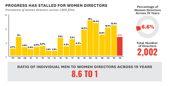 Το απογοητευτικό και για τους πιο αισιόδοξους νούμερο αντιστοιχεί σε ένα πενιχρό 8,1% επί του συνόλου των σκηνοθετών, σημειώνοντας σημαντική πτώση από το 13,4% του 2024.