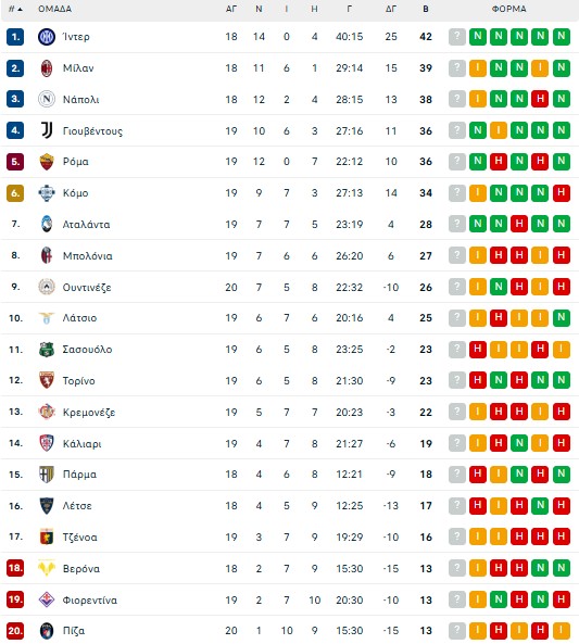 Η βαθμολογία της Serie A