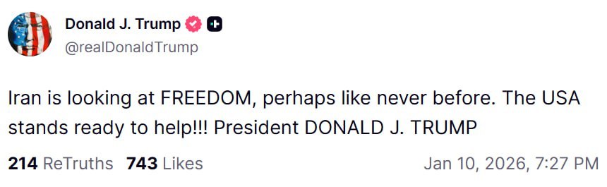Ο Ντόναλντ Τραμπ σε μια λιτή ανάρτηση για τις συνήθειές του, έγραψε ότι «το Ιράν αναζητά την ΕΛΕΥΘΕΡΙΑ, ίσως όπως ποτέ άλλοτε. Οι ΗΠΑ είναι έτοιμες να βοηθήσουν!!! Πρόεδρος ΝΤΟΝΑΛΝΤ ΤΡΑΜΠ».