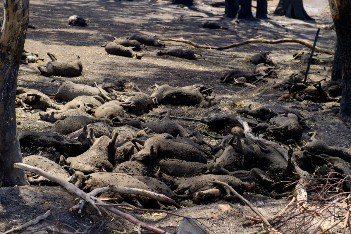 Μεγάλος αριθμός καμένων νεκρών προβάτων που βρίσκονται σε ένα λιβάδι, αφού προσπάθησαν να διαφύγουν σε ένα υπόνομο κατά τη διάρκεια των πυρκαγιών στο Ruffy, Βικτώρια, 10 Ιανουαρίου 2026.