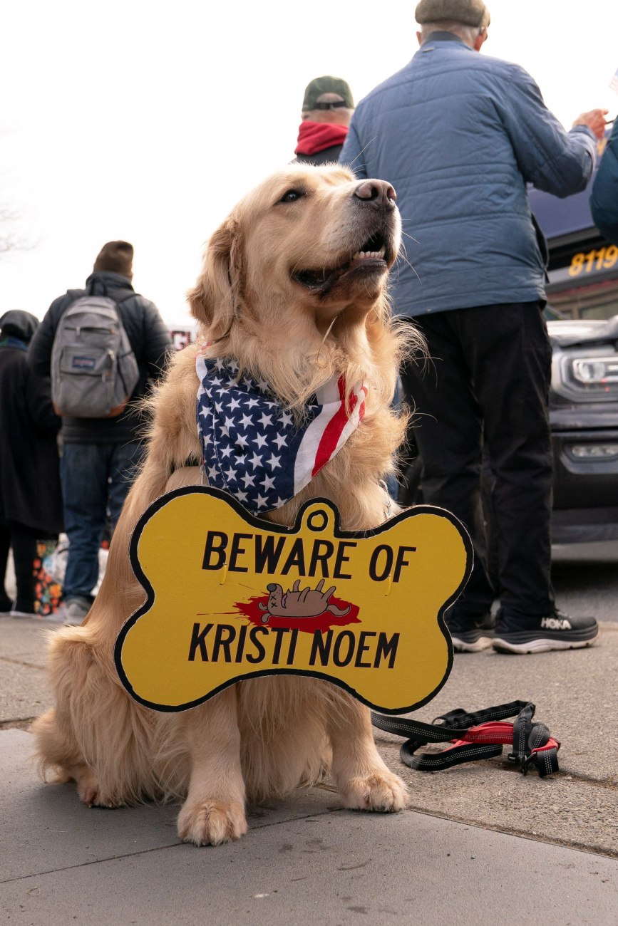 Ο Ντας, ένα γκόλντεν ριτρίβερ, φορά μια πινακίδα διαμαρτυρίας κατά της υπουργού Εσωτερικής Ασφάλειας των ΗΠΑ, Κρίστι Νόεμ, καθώς άνθρωποι συγκεντρώνονται σε διαδήλωση ενάντια στην εντατικοποίηση της μεταναστευτικής επιβολής του νόμου, μετά τον θανάσιμο πυροβολισμό της Ρενέ Νικόλ Γκουντ από πράκτορα της Υπηρεσίας Μετανάστευσης και Τελωνείων (ICE) στη Μινεάπολη. Σιάτλ, Ουάσινγκτον, ΗΠΑ, 10 Ιανουαρίου 2026. REUTERS/David Ryder.
