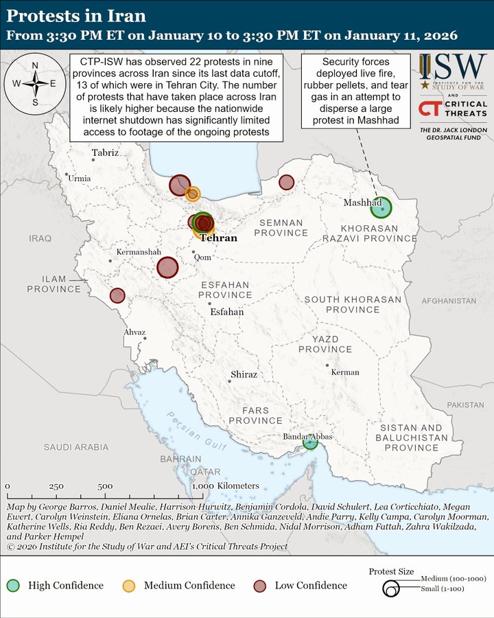 Τα think tanks με έδρα τις ΗΠΑ, Ινστιτούτο για τη Μελέτη του Πολέμου (ISW) και Κρίσιμες Απειλές (CT) κατέγραψαν λιγότερες διαδηλώσεις στις 10-11 Ιανουαρίου σε σχέση με τις προηγούμενες ημέρες.