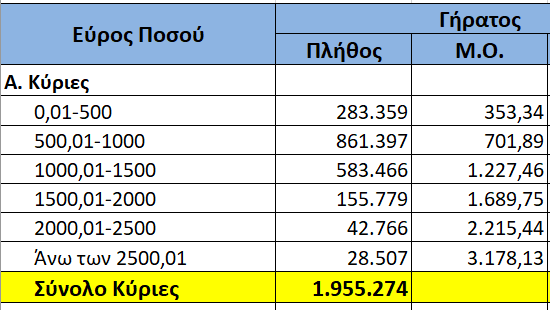 Έξι στους δέκα συνταξιούχους λαμβάνουν κύρια σύνταξη κάτω των 1.000 ευρώ ενώ το 41,45% ξεπερνά το ποσό αυτό. Συγκεκριμένα 283.359 συνταξιούχοι λαμβάνουν σύνταξη έως 500 ευρώ και 861.397 έχουν σύνταξη από 500 έως 1.000 ευρώ. Επίσης 810.518 συνταξιούχοι λαμβάνουν σύνταξη άνω των 1.000 μηνιαίως.