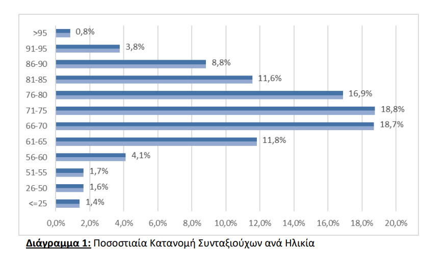 Σε ο,τι αφορά την κατανομή των συνταξιούχων με βάση το εισόδημα και την ηλικία τους στην έκθεση σημειώνονται τα εξής: το 25,01% των συνταξιούχων είναι ηλικίας άνω των 81 ετών, το 35,65% κυμαίνεται μεταξύ 71 και 80 ετών, το 36,29% μεταξύ 51 έως 70 ετών ενώ μόλις το 1,42% είναι συνταξιούχοι ηλικίας μικρότερης των 25 ετών.