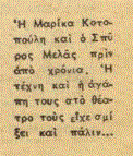 Τα γέλια μ’ έπνιγαν. Εβγήκα γρήγορα έξω, για να μη δημιουργήσω σκάνδαλο, να ξεσπάσω με την άνεσή μου. Συλλογιζόμουνα τον όγκο της αχαριστίας του τόπου —και προ πάντων του θεάτρου— προς έναν καλλιτέχνη, που είχε προσφέρει σοβαρές υπηρεσίες στην νεοελληνική σκηνή: Τον άφηναν να σέρνεται σε παρόμοιες περιοδείες στις επαρχίες, για να βγάζη το ψωμί του, να νοιώθη την ταπείνωση και την κατάντια και να βλέπη τους συντρόφους του ν’ αυτοκτονούν από την κακοπέραση. Ερημία τον κύκλωνε. Δεν υπήρχε μια γωνιά ζεστή, στοργική γι’ αυτόν, εκτός από την συντροφιά των δεσποινίδων Βέλμου, αδελφάδων του «ασπούδαχτου» ποιητή και καλλιτέχνη (σ.σ. του Νίκου Βέλμου, 1890-1930), που είχε κάνει περίφημο τ’ όνομά του, με τα γραψίματά του και τις εκθέσεις του. Αυτές τον ακολουθούσαν στις περιοδείες του και τον βοηθούσαν παίρνοντας μέρος στις παραστάσεις. Και ήταν η μόνη του παρηγοριά…