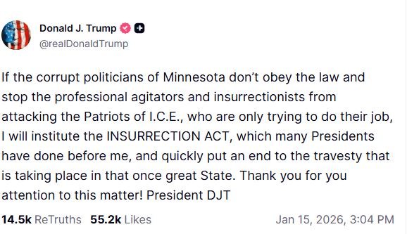 Σε μια ανάρτηση στο Truth Social, ο Τραμπ απαίτησε από τους εκλεγμένους αξιωματούχους της Μινεσότα «να σταματήσουν τους επαγγελματίες ταραξίες και εξεγερμένους από το να επιτίθενται στους Πατριώτες της ICE (την Υπηρεσία Μετανάστευσης και Τελωνείων των ΗΠΑ) οι οποίοι προσπαθούν απλώς να κάνουν τη δουλειά τους».