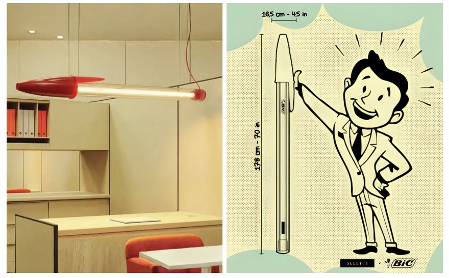 Το νέο «Bic Lamp» αναπαράγει το στυλό σε κλίμακα 12:1 και διατίθεται σε εκδόσεις δαπέδου, κρεμαστού και τοίχου, που τιμούν τις πιο αναγνωρίσιμες αποχρώσεις του μαύρου, του κόκκινου και του μπλε του γραφικού εργαλείου.