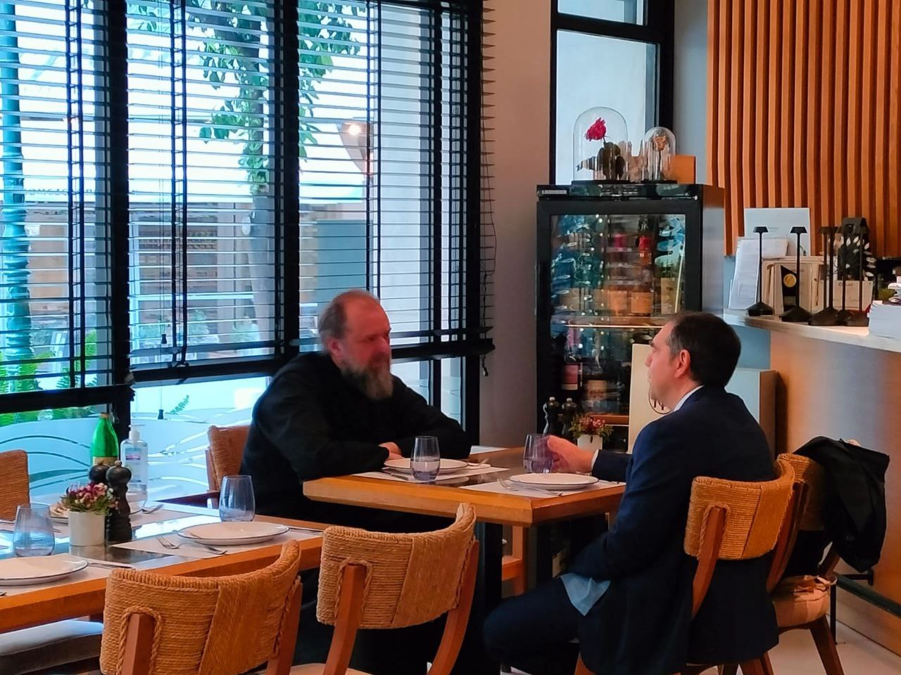 Νωρίτερα, ο Αλέξης Τσίπρας είχε συνάντηση με τον Μητροπολίτη Θεσσαλονίκης Φιλόθεο σε καφέ, στο κέντρο της πόλης.