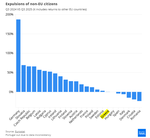 Το γειτονικό Βέλγιο φαίνεται να ακολουθεί παρόμοια κατεύθυνση, με τις επιστροφές μη πολιτών της ΕΕ να διπλασιάζονται σχεδόν από το τρίτο τρίμηνο του 2024 (730) έως το τρίτο τρίμηνο του 2025 (1.210).