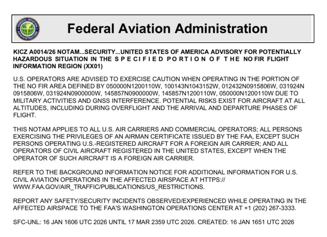 Η FAA δεν διευκρινίζει την πηγή της στρατιωτικής δραστηριότητας, αλλά δήλωσε ότι οι αεροπορικές εταιρείες θα πρέπει να παραμένουν σε εγρήγορση για την πιθανότητα παρεμβολών στην πλοήγηση στις πληγείσες περιοχές.