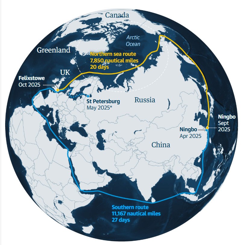 Γραφικό του Guardian. Πηγή: Δεδομένα παρακολούθησης: MarineTraffic. Υπολογισμοί διαδρομής: Κέντρο Logistics του Βόρειου Πόλου. Σημείωση: *Απόσταση με βάση την πραγματική διαδρομή που διανύθηκε. Οι μετρήσεις για τη νότια διαδρομή του πλοίου από την Κίνα υπολογίστηκαν μέχρι λίγο μετά το λιμάνι του Felixstowe. Ο χρόνος μεταφοράς δεν περιλαμβάνει τις παραμονές στα λιμάνια.