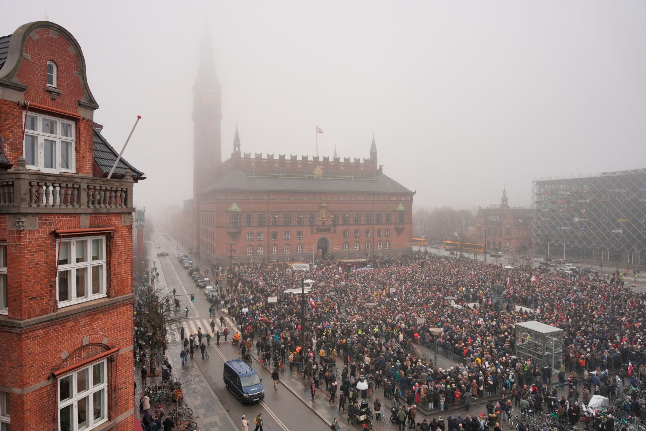 Κρατώντας σημαίες της Δανίας και της Γροιλανδίας, οι διαδηλωτές δημιούργησαν μια κόκκινη και λευκή θάλασσα έξω από το δημαρχείο της Κοπεγχάγης, φωνάζοντας «Kalaallit Nunaat!» — το όνομα του τεράστιου αρκτικού νησιού στη γροιλανδική γλώσσα.