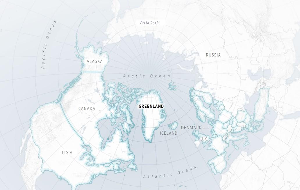 …αν το δούμε με ακριβή μεγέθη, η Γροιλανδία συρρικνώνεται λίγο και βρίσκεται σαφώς κοντά στη Βόρεια Αμερική —και στο κέντρο της επικράτειας του Οργανισμού Βορειοατλαντικού Συμφώνου.