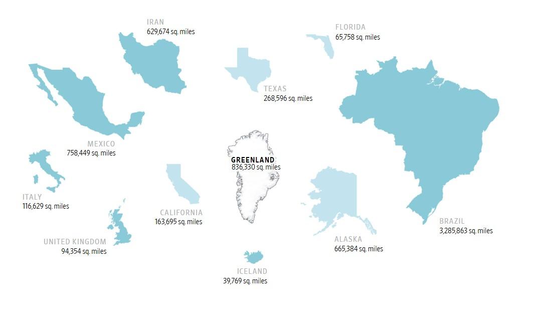 Παρόλα αυτά, η Γροιλανδία είναι μεγάλη. Είναι μεγαλύτερη από την Καλιφόρνια και το Μεξικό και σχεδόν τέσσερις φορές μεγαλύτερη από το Τέξας.