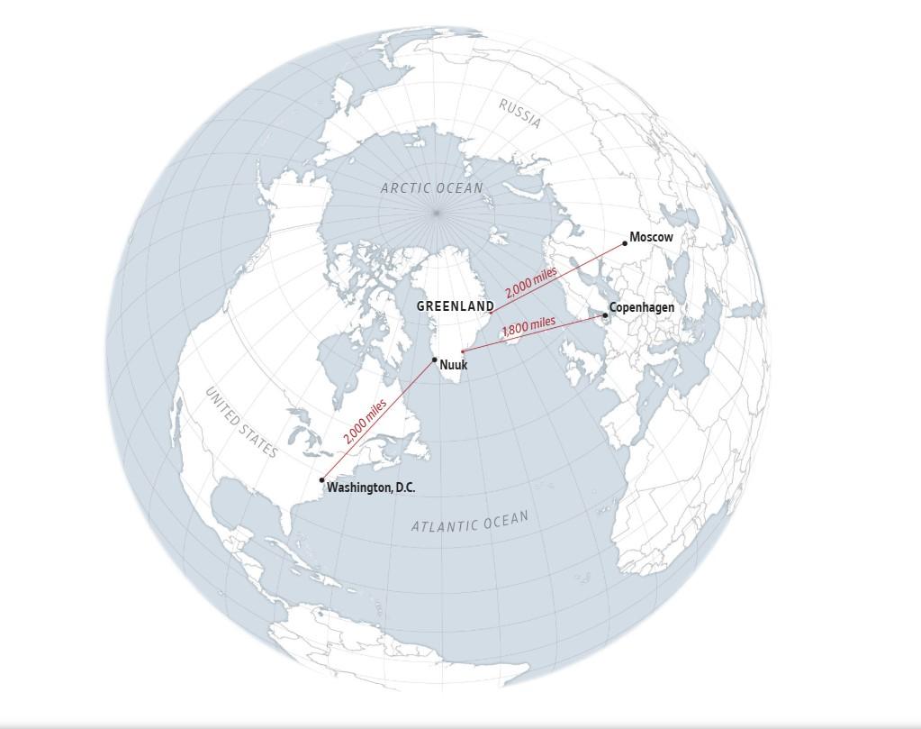 Η Γροιλανδία βρίσκεται επίσης σε μια εξαιρετικά στρατηγική θέση: μεταξύ των βορειοαμερικανικών και ευρωπαϊκών τμημάτων του ΝΑΤΟ, μεταξύ του ΝΑΤΟ και της Ρωσίας, και στο ανατολικό άκρο της Αρκτικής. Αυτός είναι ο λόγος για τον οποίο οι ΗΠΑ έχουν προσπαθήσει επανειλημμένα να αγοράσουν το νησί για περισσότερο από έναν αιώνα.