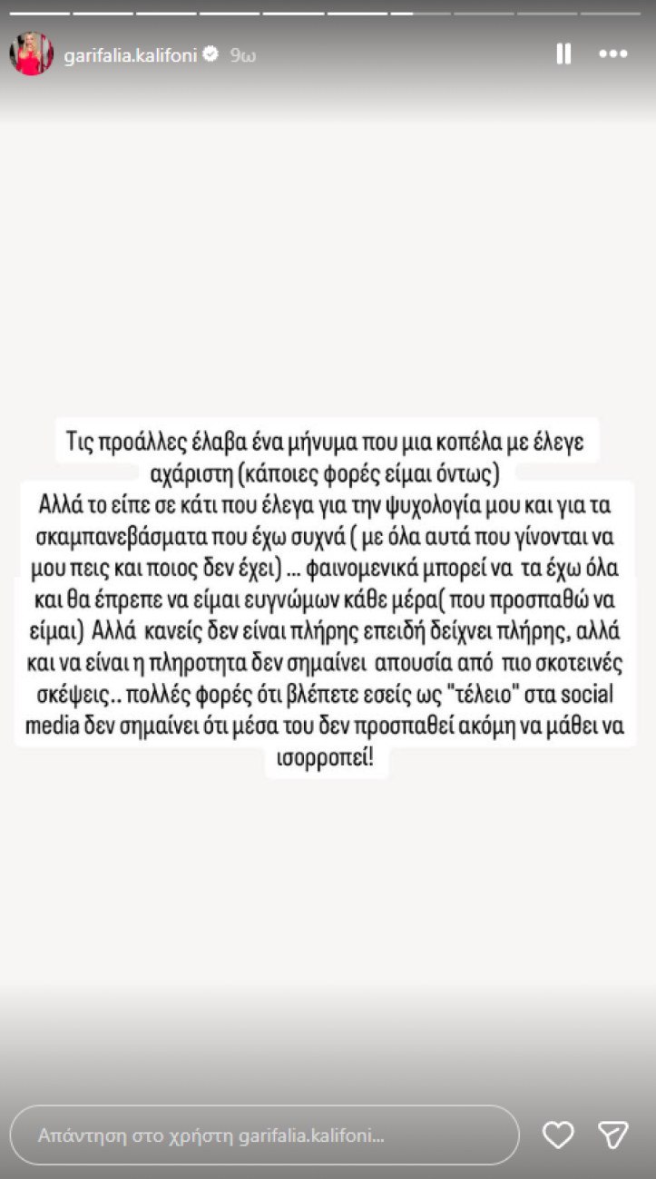 Αφορμή στάθηκε ένα μήνυμα που έλαβε και την κατηγορούσε για «αχαριστία», οδηγώντας την να εξηγήσει πως ακόμη και άνθρωποι που δείχνουν ότι «τα έχουν όλα» μπορεί να βιώνουν ανασφάλειες, σκαμπανεβάσματα και σκοτεινές σκέψεις. Μέσα από τα λόγια της, η Γαρυφαλλιά Καληφώνη, θέλησε να υπενθυμίσει ότι η εικόνα της τελειότητας στο διαδίκτυο σπάνια αποτυπώνει ολόκληρη την αλήθεια.